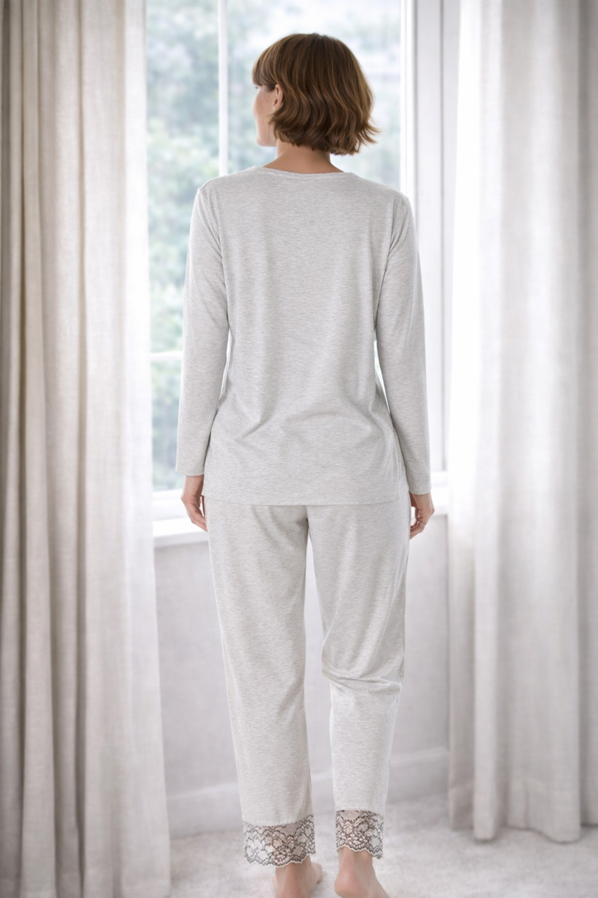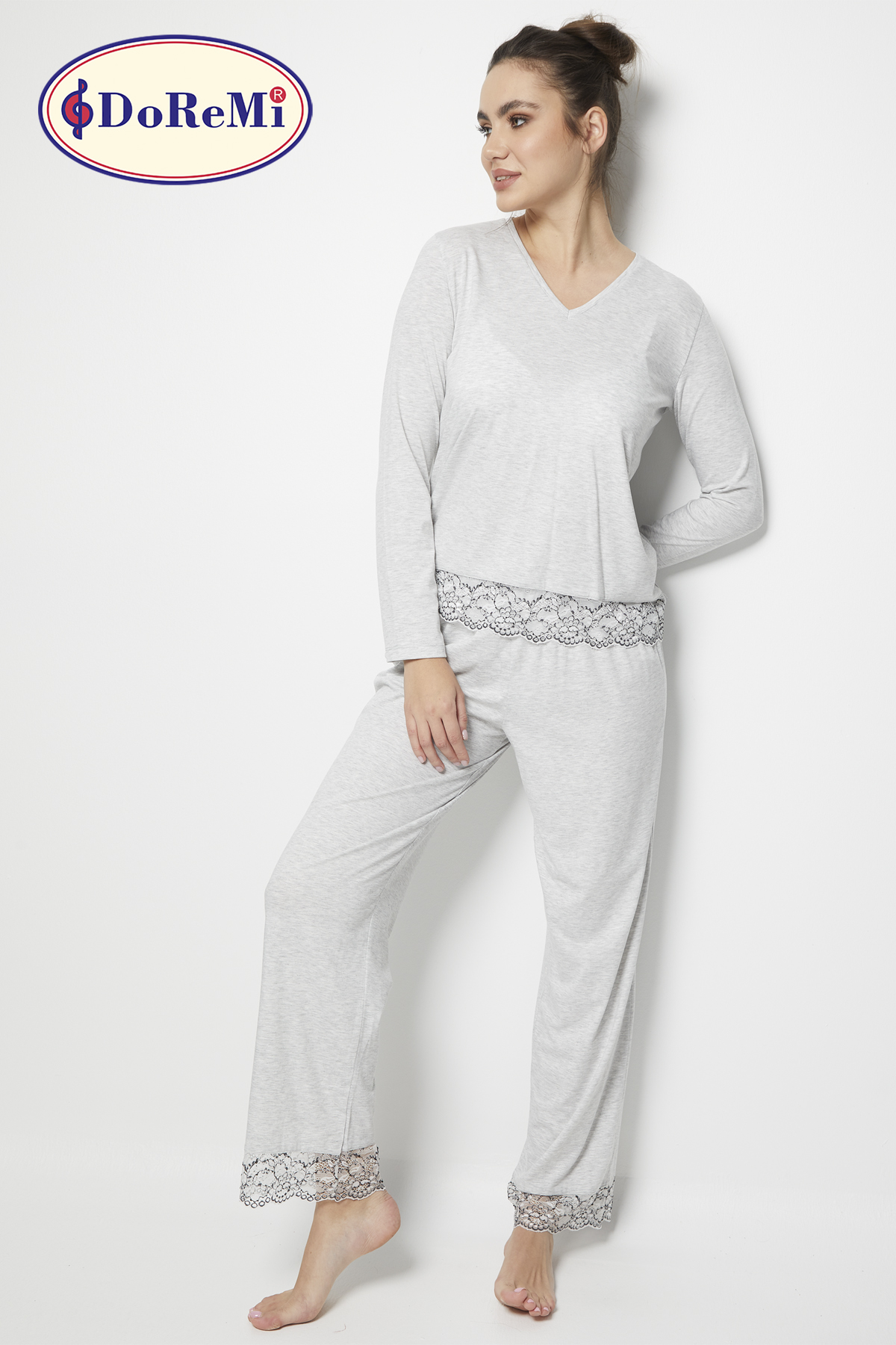 DoReMi Romance Pijama Takım, penye kumaşın nefes alan yapısıyla konforu yaşatırken, üst ve alt parçaların uçlarındaki dantel ile romantizme ışık yakıyor.