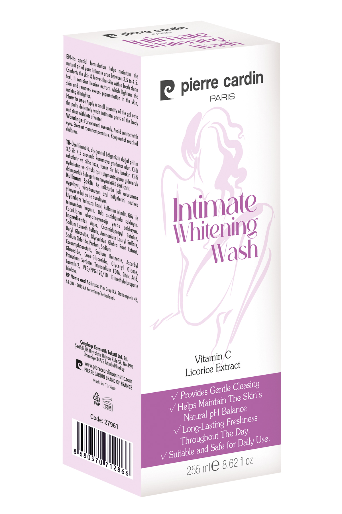 Pierre Cardin Intimate Whitening Wash, özel formülüyle genital bölgenizin doğal pH dengesini (3.5–4.5 arası) korumaya yardımcı olur. İçeriğinde yer alan meyan kökü ve C vitamini sayesinde ciltteki ton eşitsizliklerinin görünümünü azaltmayı desteklerken ferah ve temiz bir his bırakır. Günlük kullanıma uygun olan bu temizleyici jel, cildinizi nazikçe arındırarak uzun süreli tazelik sunar.
