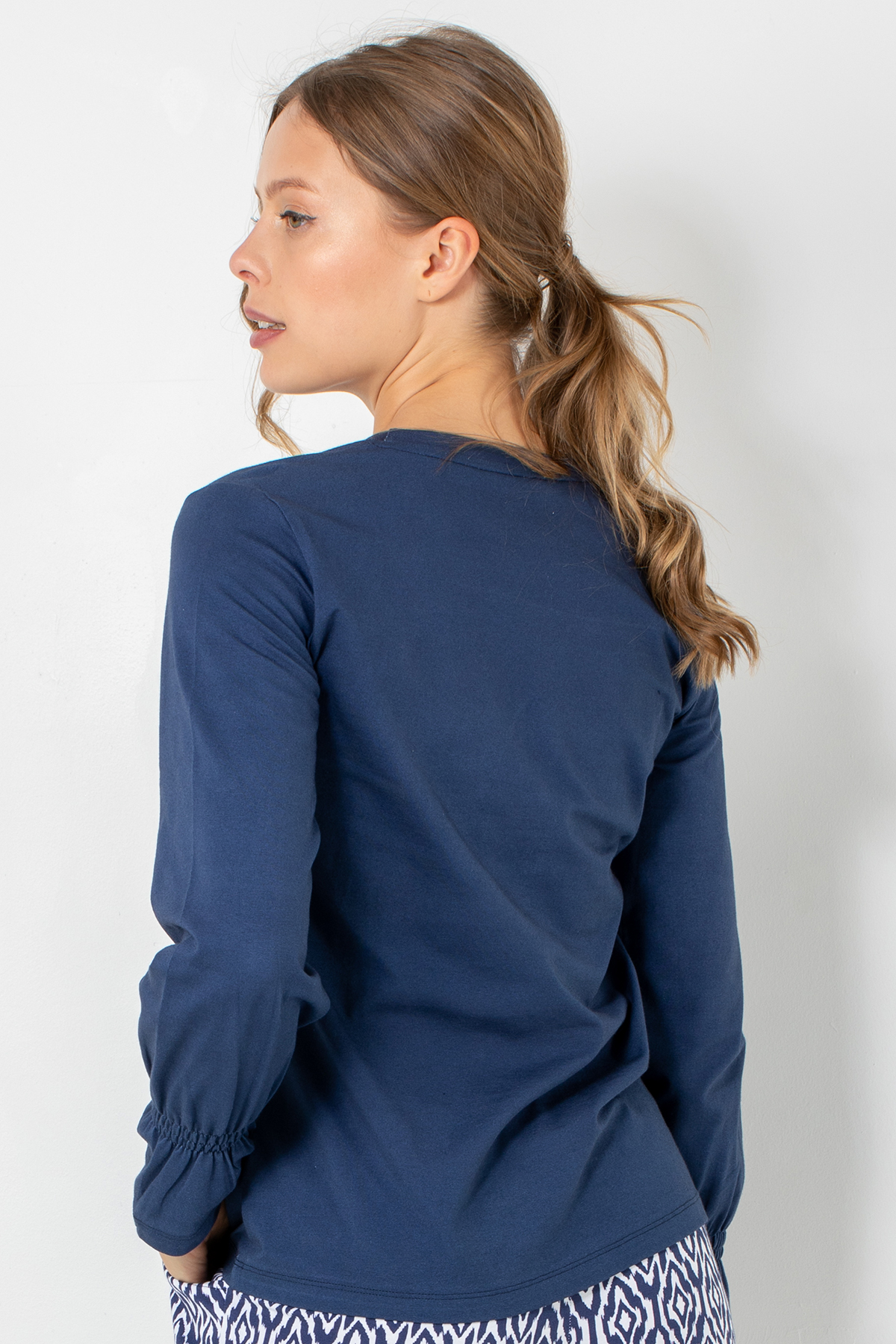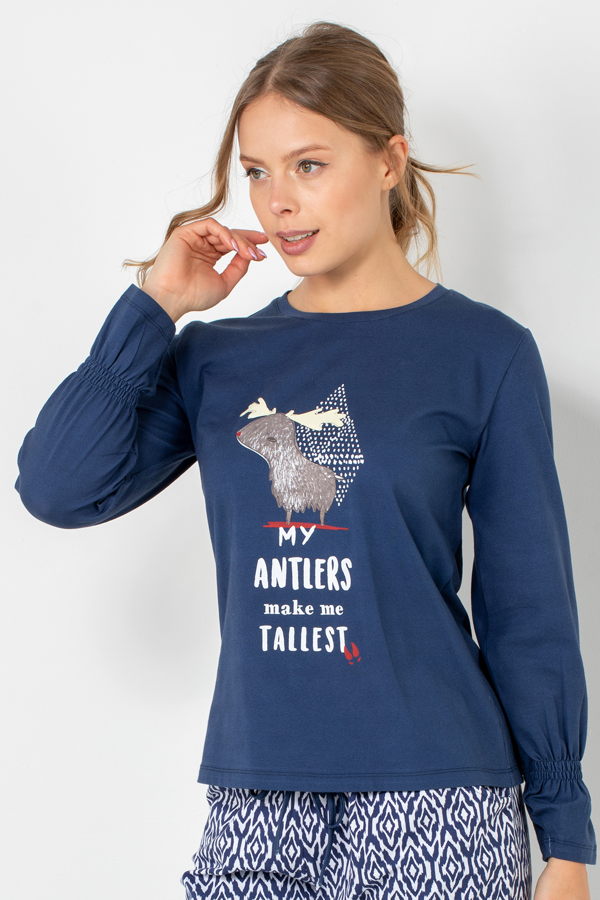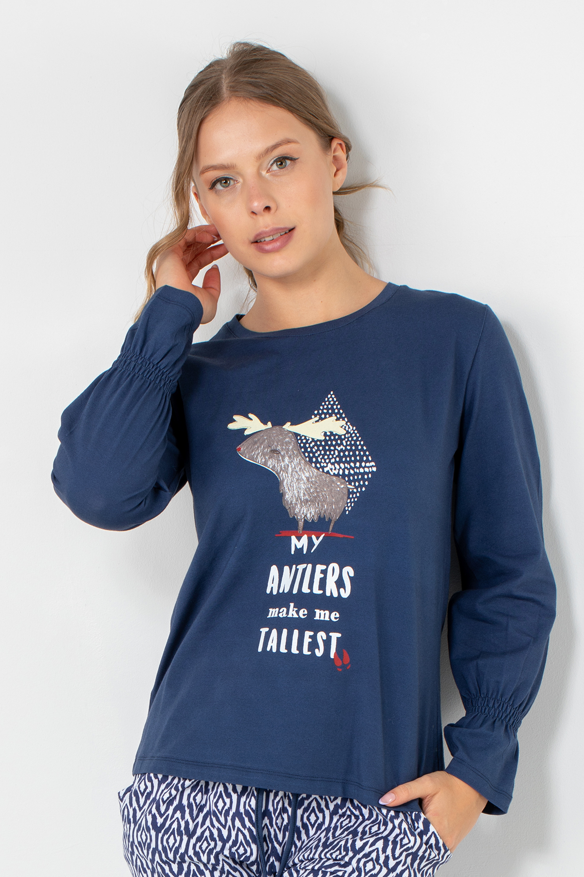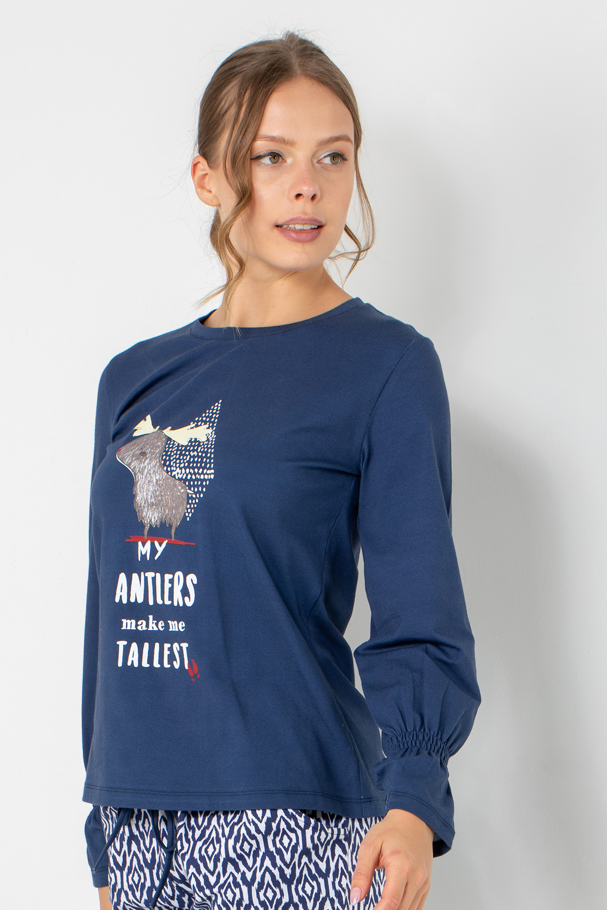 Rahatlığın enerjik bir tarzla buluştuğu bu model, eğlenceli baskısı ve yumuşak dokusuyla ev giyiminin vazgeçilmez parçalarından biri. Cilde dost pamuklu kumaşı, gün boyu konfor sağlarken uzun kollu tasarımıyla serin akşamlarda sıcak bir his verir. Modern detaylarıyla evde şıklığı seven kadınların favorisi olacak.
