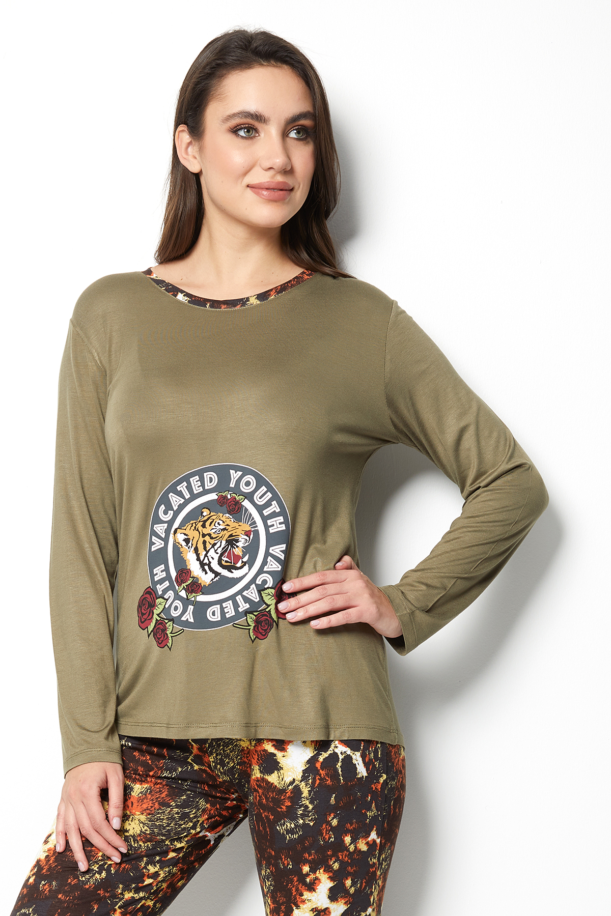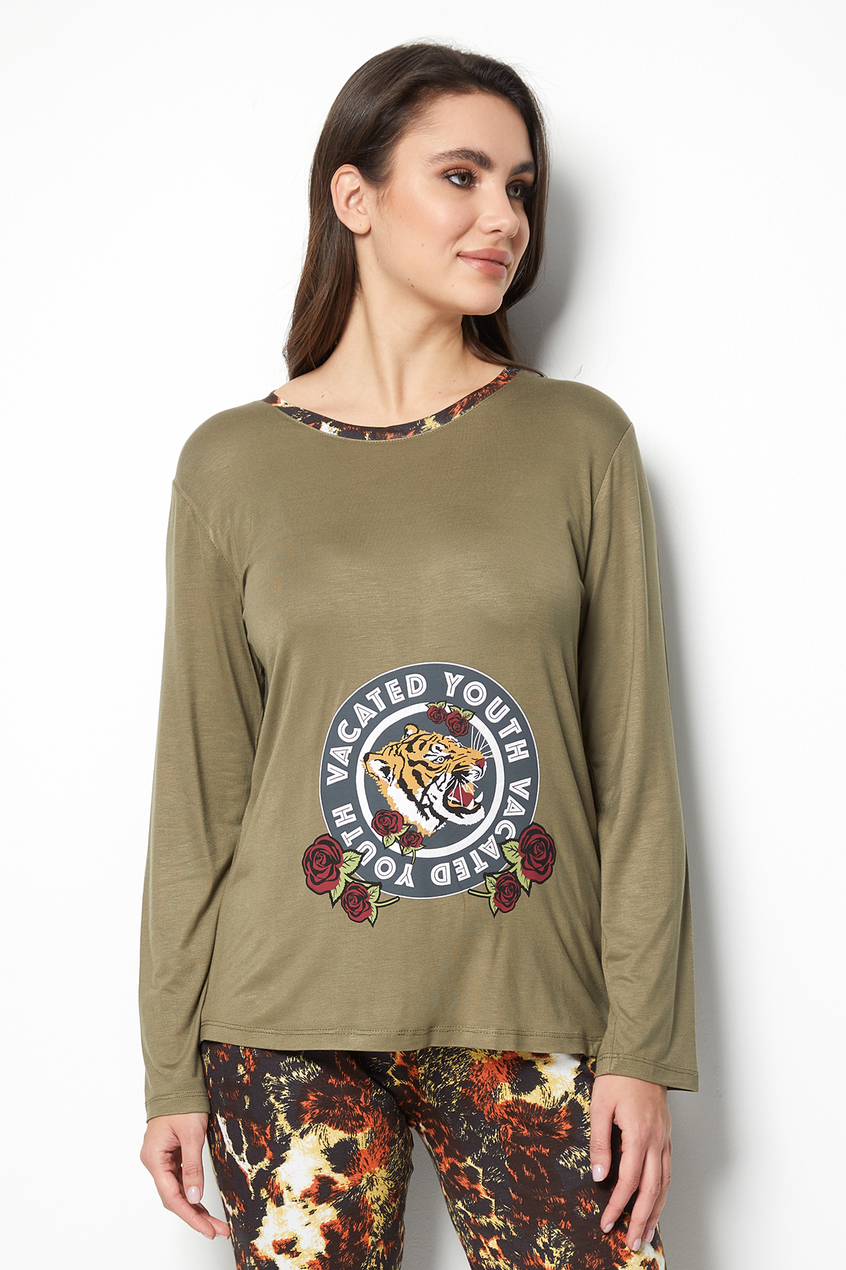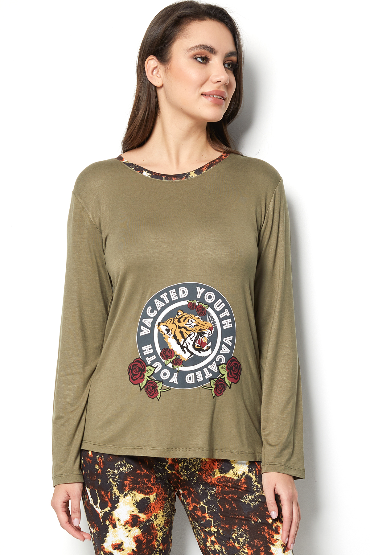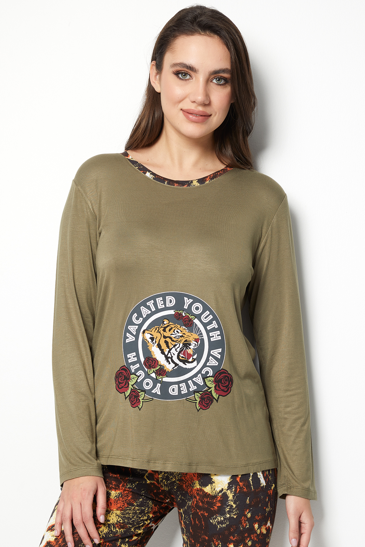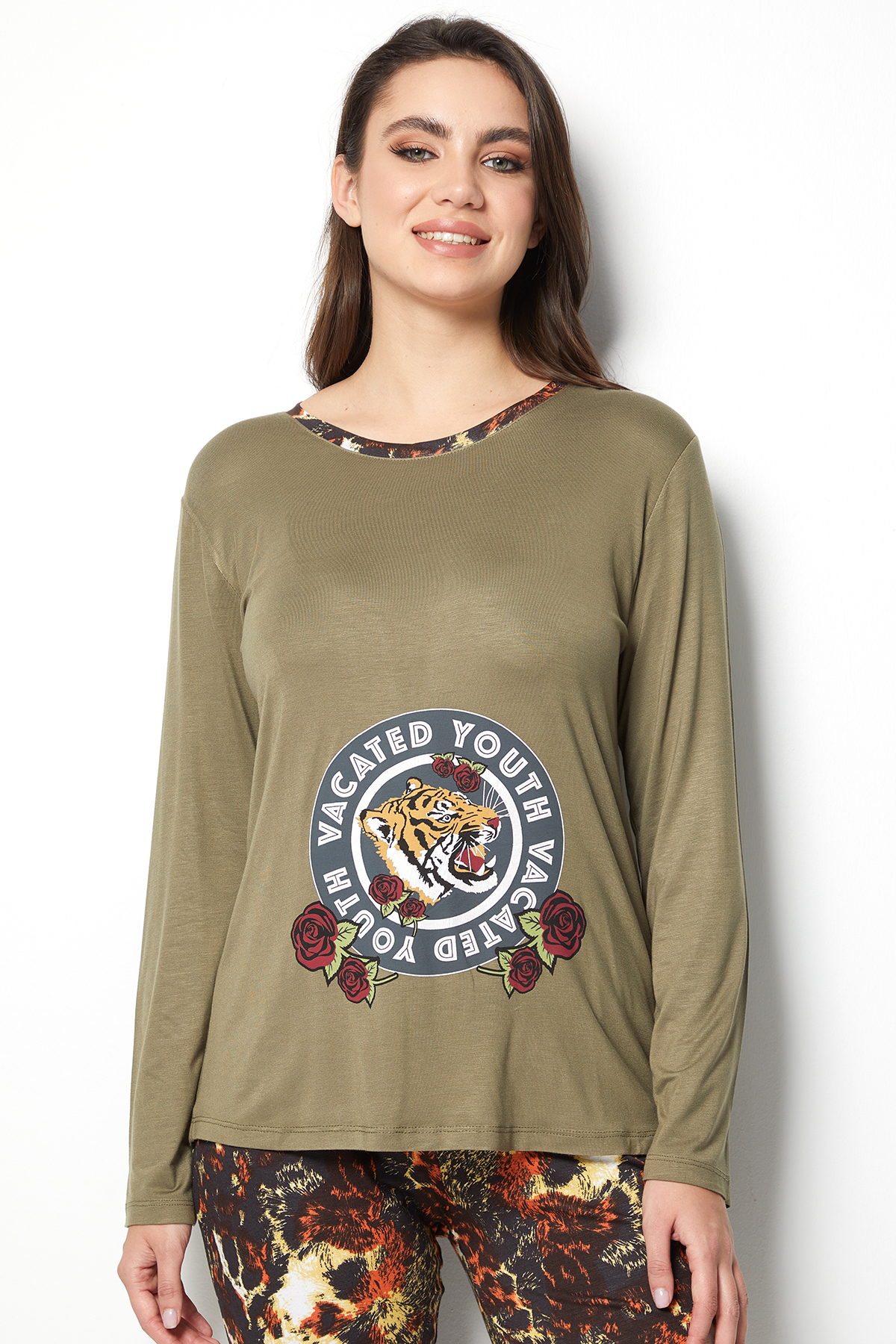 Cesur ve modern bir stile sahip DoReMi Bayan Pijama Üstü, özgün baskı detayıyla klasik ev giyimine karakter katar. Yumuşak dokulu kumaşı cilde nazikçe temas ederken, rahat kalıbı hareket özgürlüğü sağlar. Leopar desenli yaka içi ve baskı detayları, sıradan pijamalardan farklı olarak enerjik bir görünüm oluşturur.