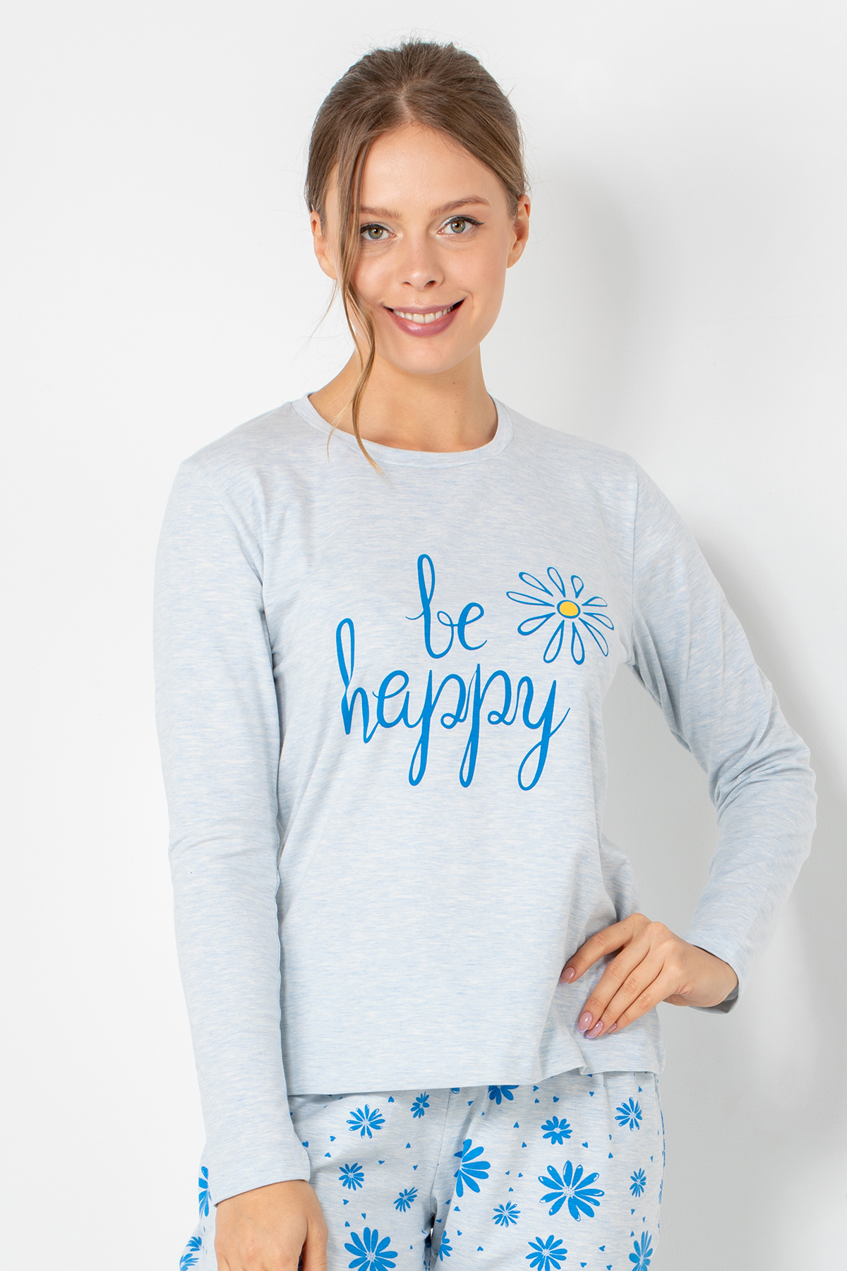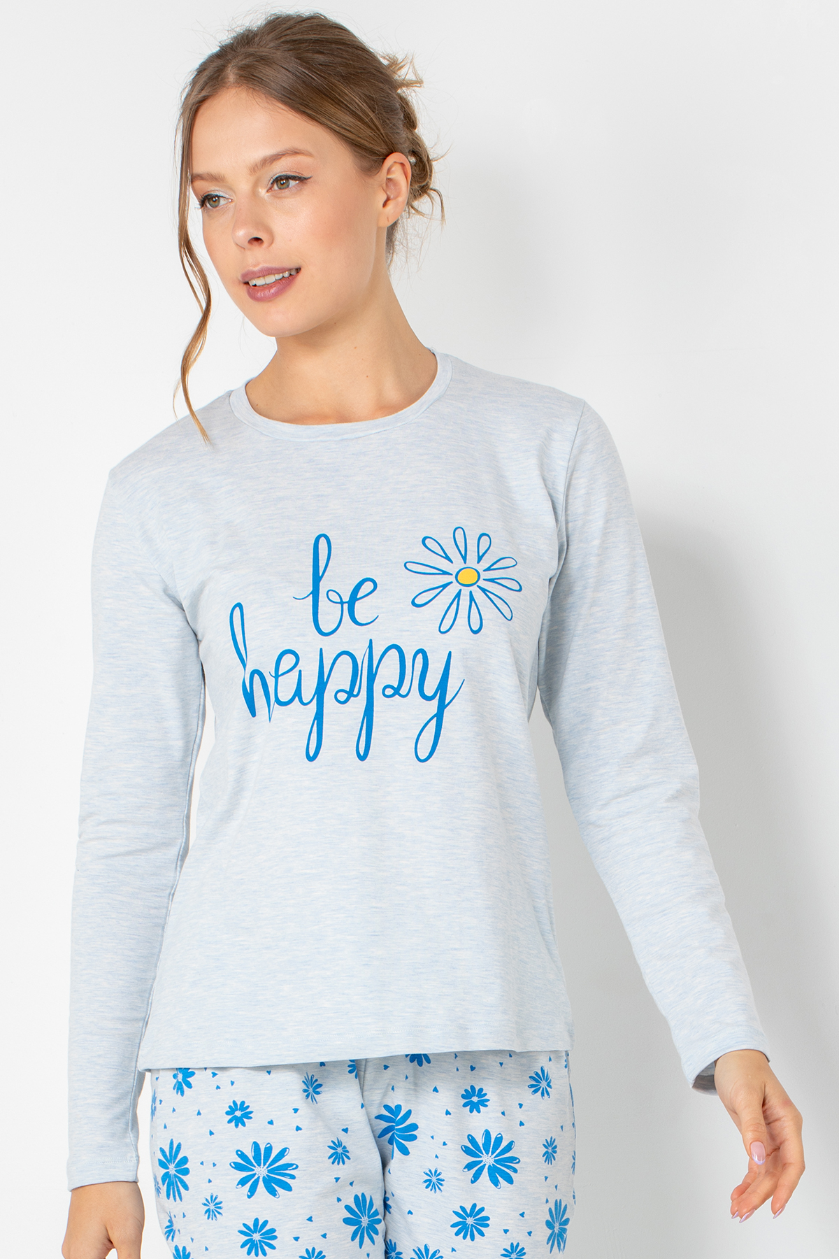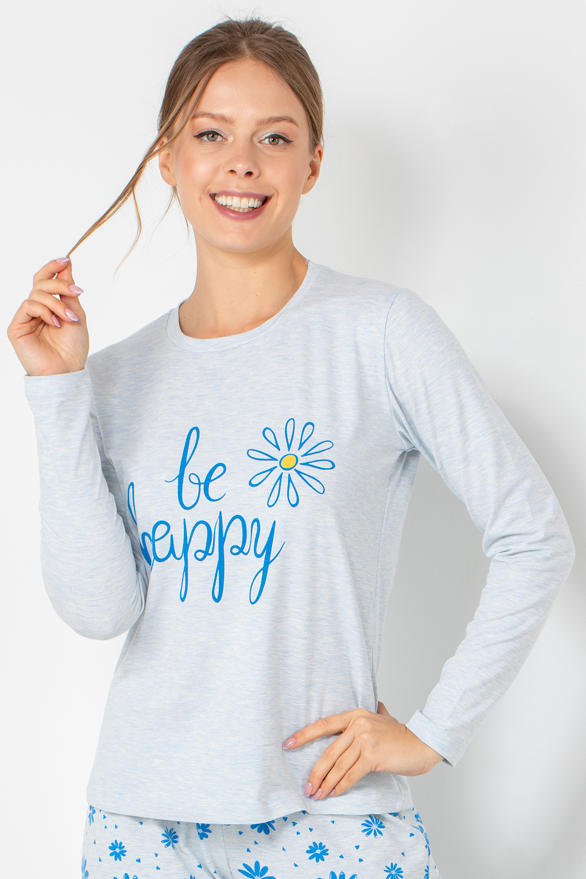 Pozitif enerjiyi yansıtan tasarımıyla DoReMi Bayan Pijama Üstü, rahatlığın yanı sıra neşeli bir görünüm sunar. “Be Happy” baskısı ve papatya deseni, sade tasarıma canlı bir dokunuş katar. Nefes alan, yumuşak kumaşı cildi sararken, uzun kollu formu sayesinde serin akşamlarda sıcak tutar.