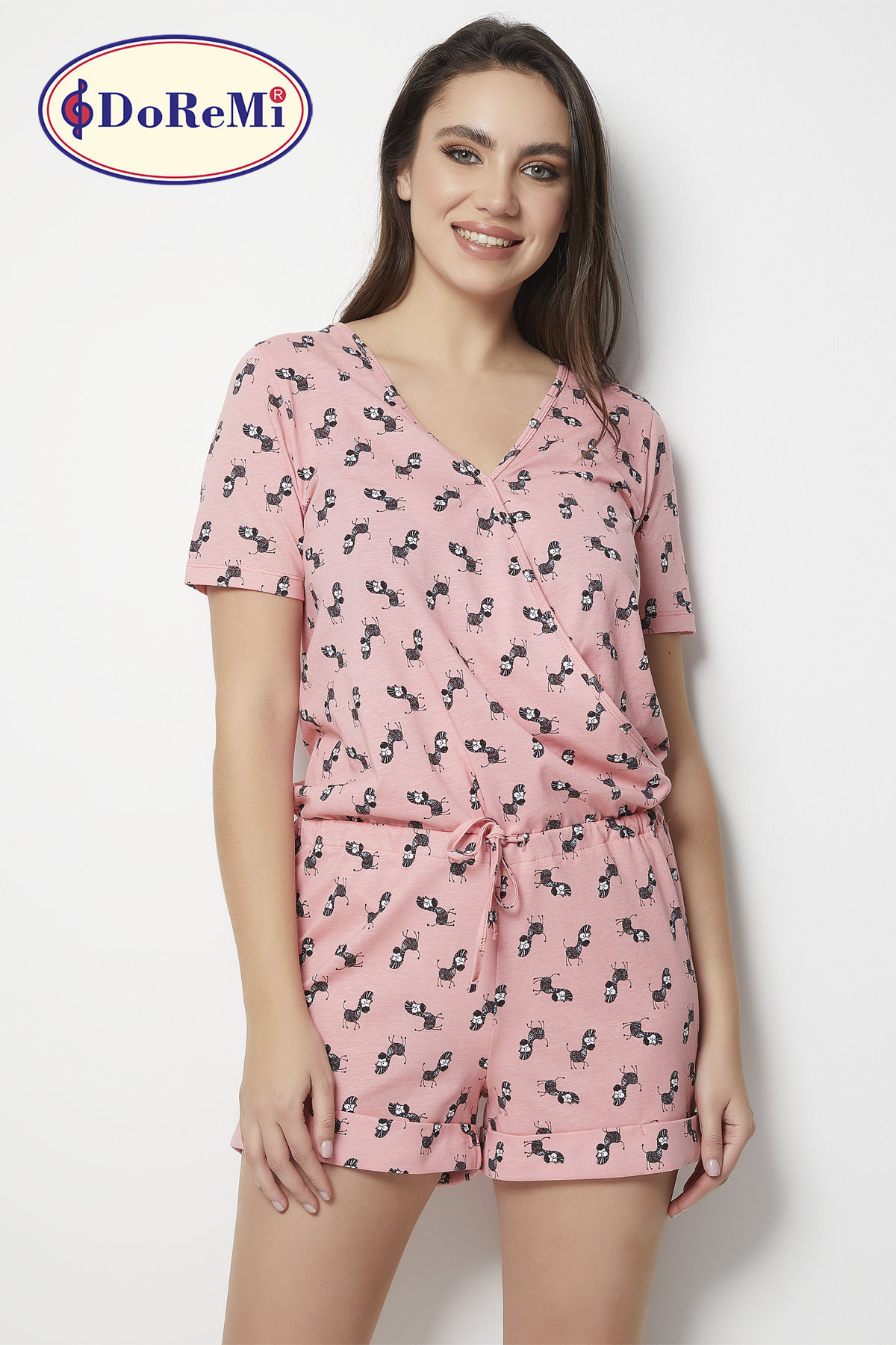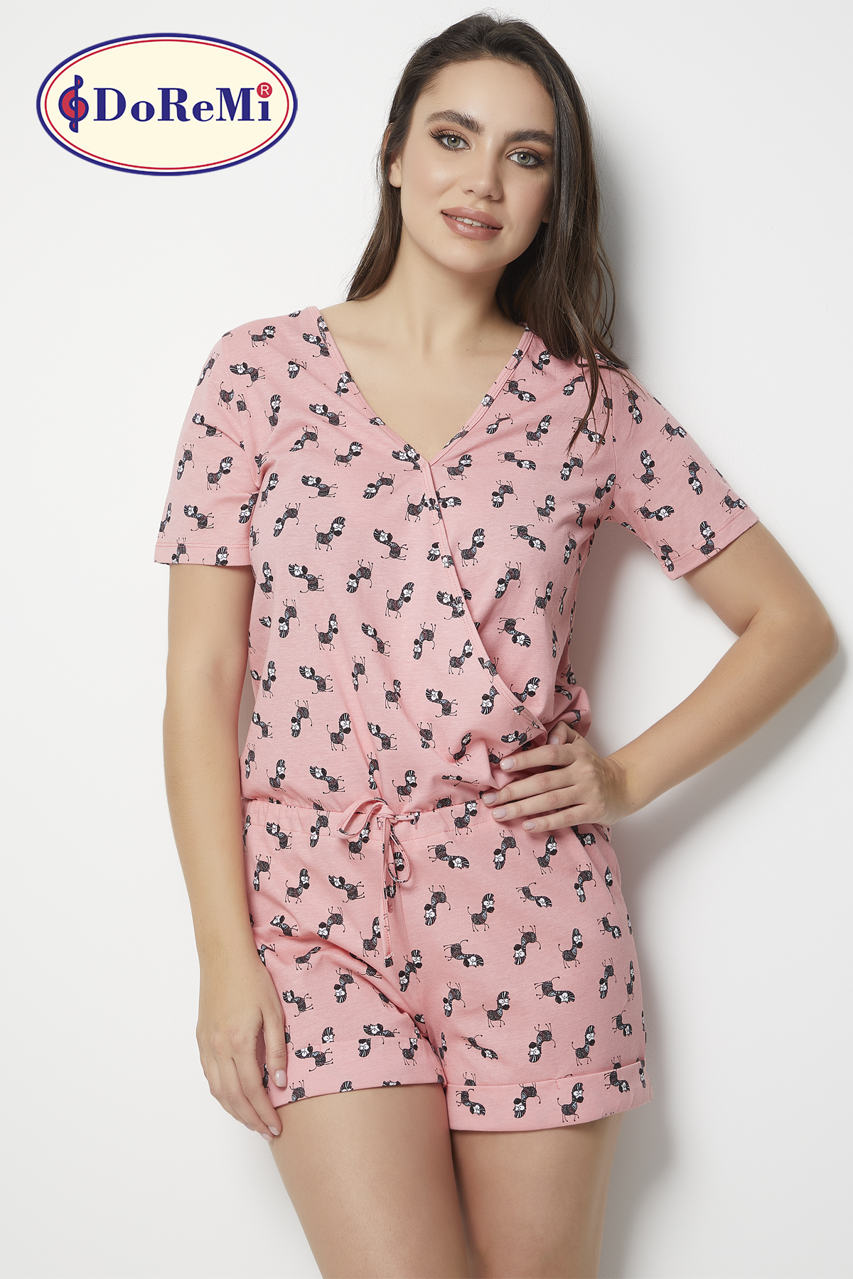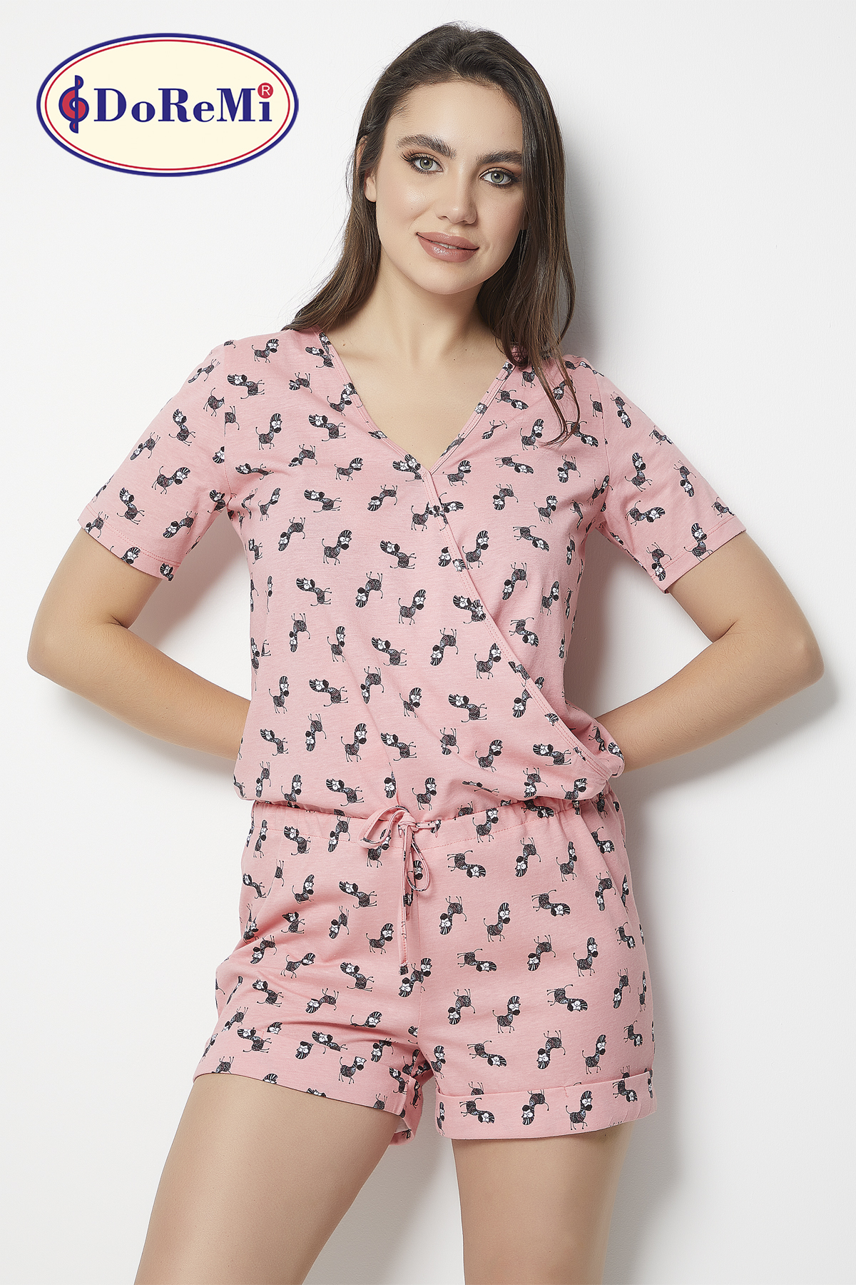 Kısa kollu, V yaka kesimli, ayarlanabilir bel bağcıklı DoReMi tulum ile gözler üzerinizde olacak.