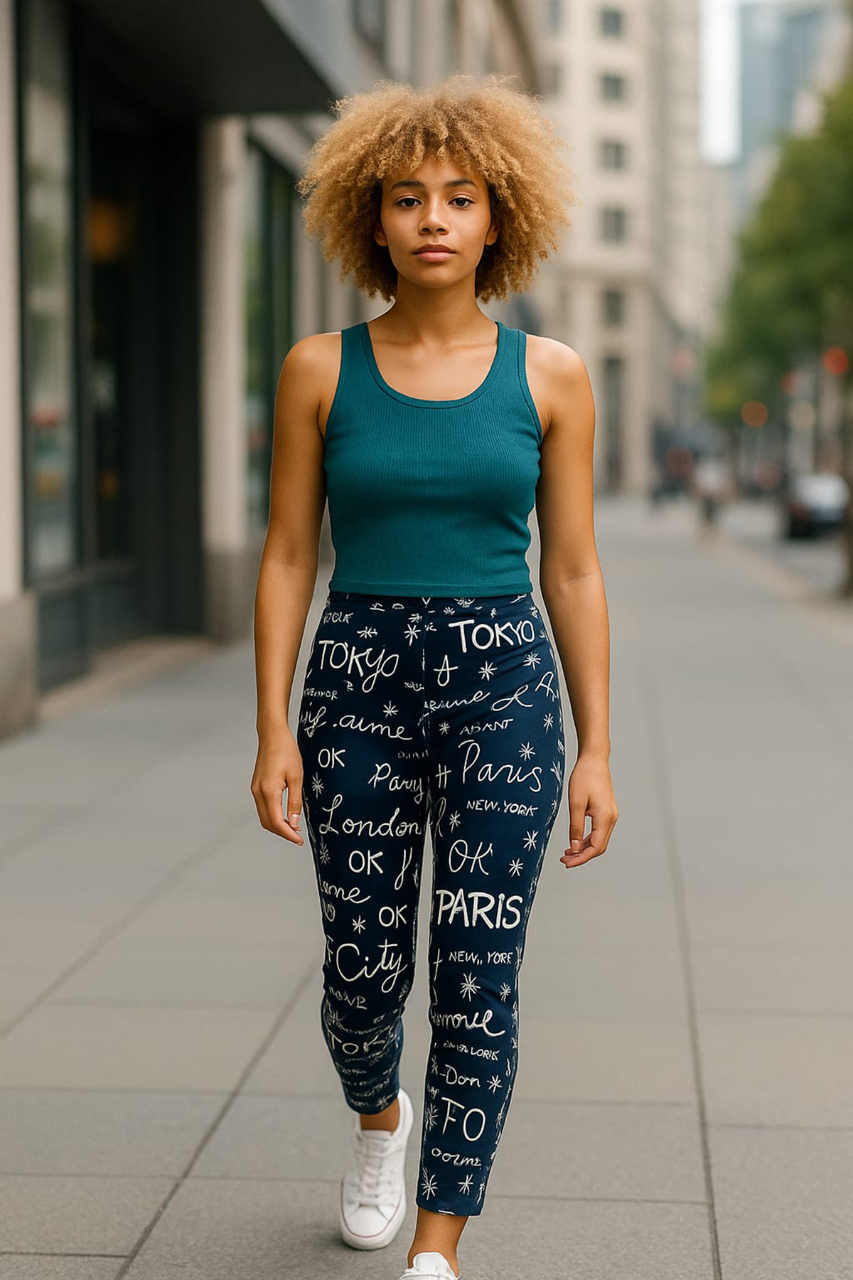Günlük kullanımda esneklik arayanlar için tasarlanan bu tayt, hareket özgürlüğünü destekleyen yapısıyla rahat bir deneyim sunar. Üzerindeki yazı ve şehir temalı desenler, ürüne dinamik bir görünüm kazandırırken kombinlemeyi de kolaylaştırır. Bel kısmındaki elastik yapı gün boyu konfor sağlarken, kumaş formu vücuda uyumlu bir siluet oluşturur.