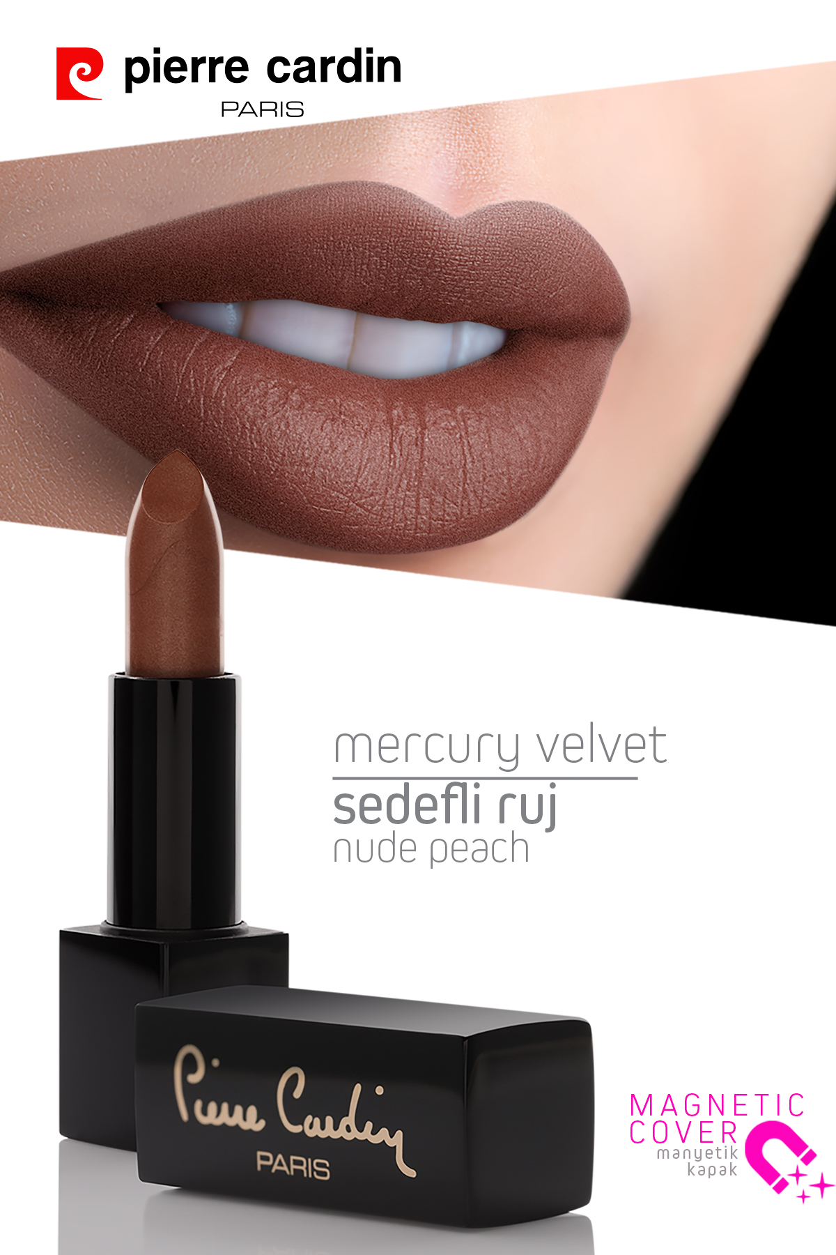 Pierre Cardin Mercury Velvet Lipstick serisi, sofistike duruşunuzu yansıtan cesur ve metalik mat dokusuyla dudaklarda büyüleyici bir etki yaratmak için tasarlandı. Yoğun pigmentli ve kadifemsi yapısı sayesinde tek sürümde doygun renk verirken, yumuşak ve konforlu formülü dudaklarda ağırlık yapmadan gün boyu kalıcılığını korur.